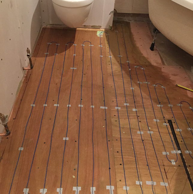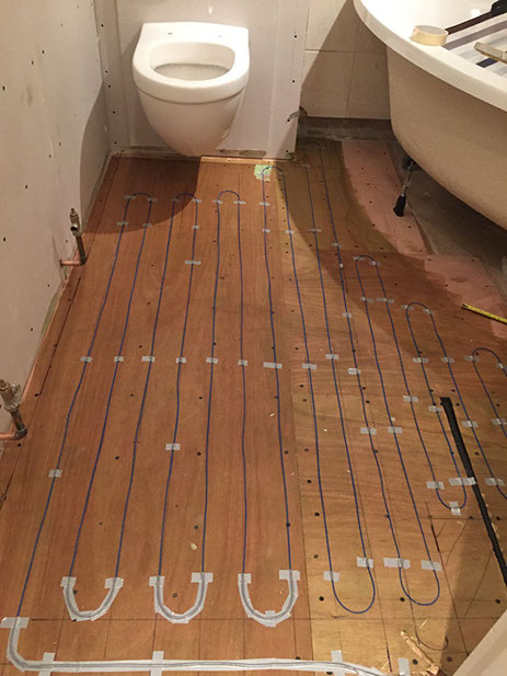 Tiling up to bath skirt line covers underfloor heating cable